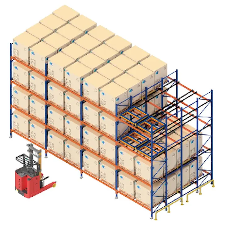 Push back racking combines rails and trolleys on a slight incline, allowing multiple pallets to be stored in a lane. Goods are loaded from the front, and as a new pallet is placed, the previous one is pushed back. Retrieval follows the Last-In, First-Out (LIFO) method. This makes it an excellent choice for high-density storage where selectivity is less critical.
